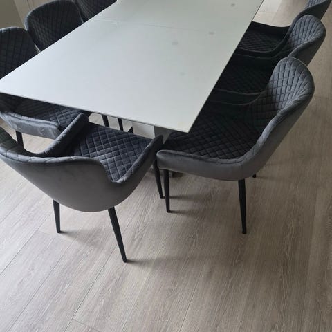 Selger en elegant spisegruppe bestående av solid sort spisebord og 6 komfortable stoler i myk velur. Perfekt for både hverdag og selskap!