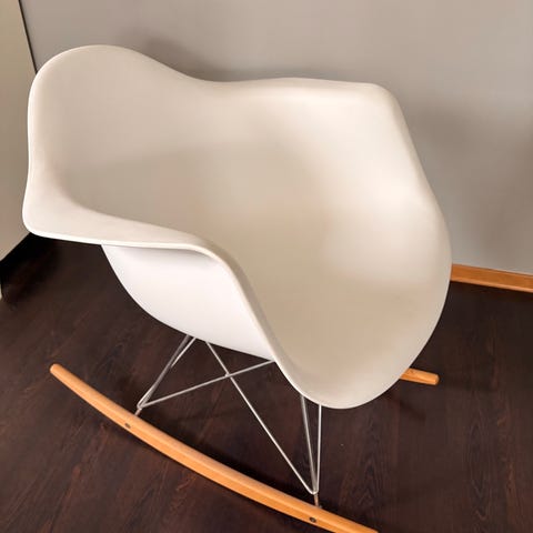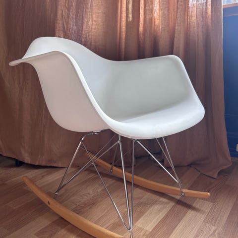 Pen, veldig lite brukt gyngestol selges. Setet er i kraftig hvit plastikk, understellet i metall og gjengene i tre. Kjøpt brukt selv, så kan derfor ikke garantere at det er Eames, men uansett veldig pen! Selges for 800 kr. Kan hentes Vormedal/Haugesunds området.