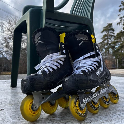 Hilco rulleskøyter i størrelse 43. Rulleskøytene har svart yttermateriale med gule detaljer og hvite lisser. Modellen har flere hjul på rekke og er egnet til bruk på jevnt underlag. Innvendig polstring gir støtte rundt ankel og fot. Passer til fritidsbruk for voksne med skostørrelse 43.