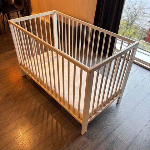 IKEA sprinkelseng i hvit utførelse. Sengen har sprosler på alle sider og bunn i trelameller. Egnet som seng til baby og småbarn. Madrass følger ikke med dersom ikke annet er oppgitt i annonsen. Passer på barnerom eller som ekstra seng hos familie eller i barnehage, avhengig av mål og behov.