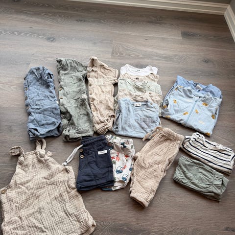 Nydelig pakke med flere seleshorts, noen drakter, kortermede bodyer, solhatt, shortser og et par luftige bukser i musselin og bambus☀️