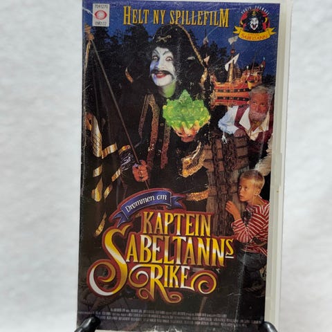 Kaptein Sabeltann og Hemmeligheten i Kjuttaviga VHS videokassett. Norsk barnefilm/teateroppsetning utgitt på videokassett. Fysisk format er VHS med omslag. Passer til VHS‑spiller for avspilling av filmen om Kaptein Sabeltann og handlingen i Kjuttaviga.
