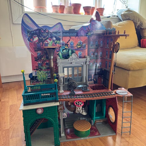 Teenage Mutant Ninja Turtles lekesett med lekeslott og flere figurer. Settet inkluderer bygning, bakgrunnsvegg og detaljer som dør, vinduer, rør og plattform. Det følger også med en egen del som forestiller en subway-inngang med skinner under.