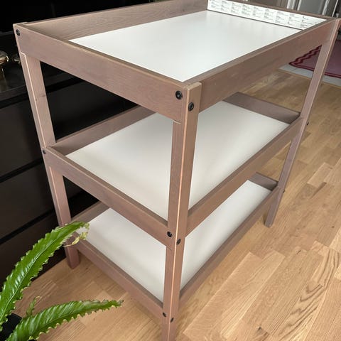 Platene er foliert svart, kan nok lett fjernes. En hylle er laget for mer oppbevaring. Ypperlig og lite Stellebord.