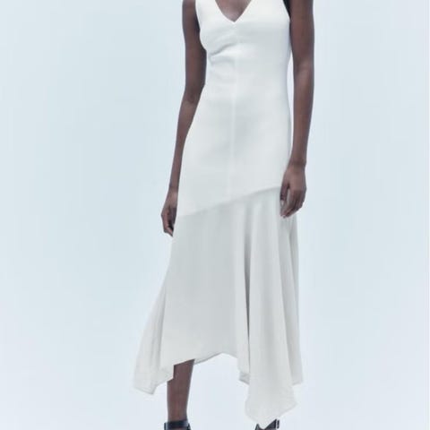 Zara sommerkjole for dame i størrelse L. Kjolen er hvit og laget i bomull. Modellen har kort erm og lengre skjørt med flere sømmer/partier som gir et lett og luftig uttrykk. Passer som sommerkjole til hverdagsbruk eller enkle anledninger.