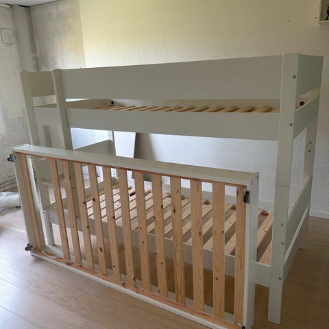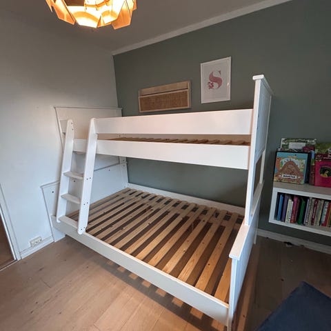 Flott køyeseng fra det danske merket Oliver Furniture i fullgod stand. Noen få og små skraper i malingen og et par små sprekker i enden (se eget bilde). Fin (myk) Jensen Madrass og annen enklere (fast) madrass kan medfølge for kr 2000 ekstra. Sengen er delvis demontert og kan demonteres ytterligere ved behov ift transport. Komplett sett av skruer (+++) og nødvendig verktøy medfølger. Hentes hos oss eller vi kan evt levere til ytterdør på gateplan i Oslo for kr 300.