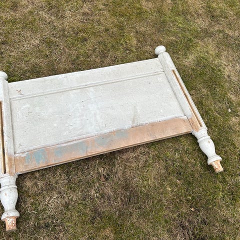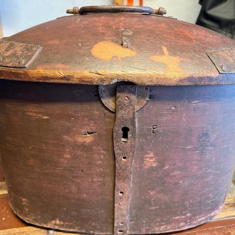 Malt utvendig. Påsatt små beslag for mulig låsing. Det faste stykket som holder lokket i enden, har røket, men delene er festet på igjen med småspiker. Fin til pynt og oppbevaring. L: 68, B: 46, H: 47 cm. inkl. håndtaket. Hentes i Moelv.