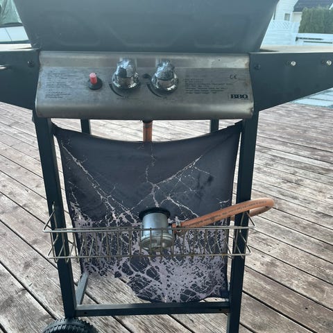 Gassgrill med to brennere og lokk. Grillen har sidebord på begge sider for avlastning, samt nedre hylle i metall for oppbevaring av utstyr. Fronten har panel med to reguleringsknapper for justering av varme. Grillrist og varmefordeler er plassert under lokket. Grillen er egnet til grilling på terrasse, balkong eller i hage der det er tilgang til gassflaske (ikke inkludert).