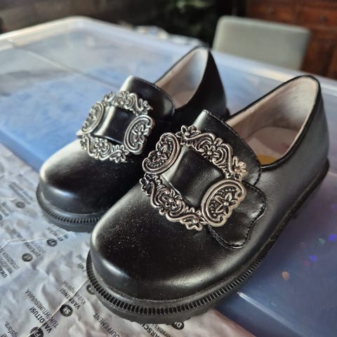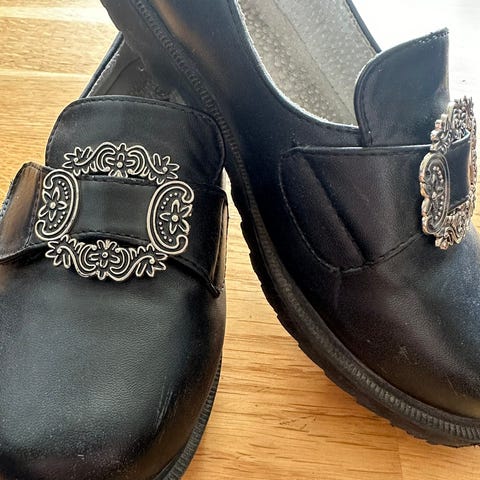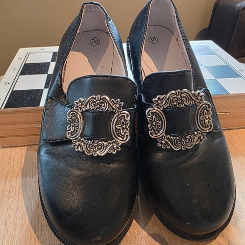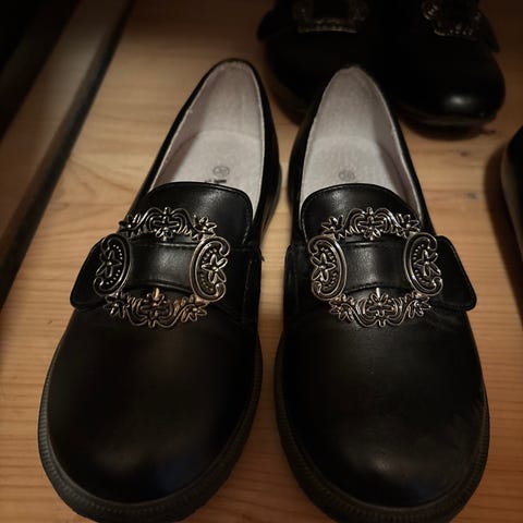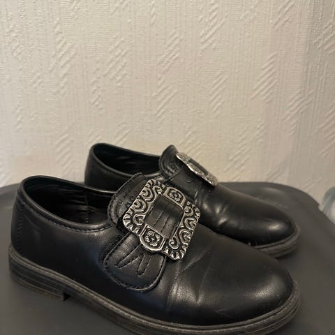 Bunadsko til barn med praktisk borrelåslukning over vristen. Overdel i kunstskinn og fôret med ekte skinn. Solid og stødig yttersåle. Avtagbar spenne gjør at skoen kan brukes som pensko ellers i året.