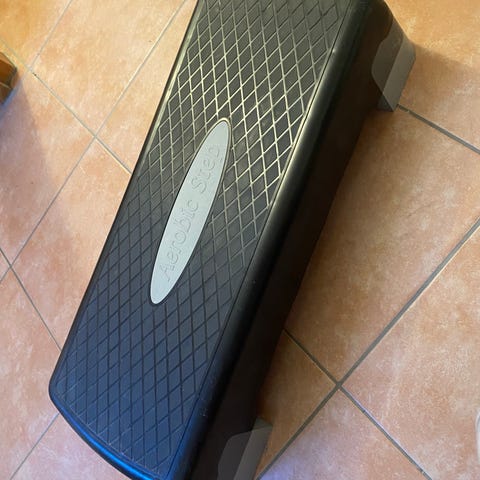 Aerobic stepbrett i svart, grått og rødt. Brettet har sklisikker overflate med mønster på toppen for bedre fotfeste. Egnet til ulike treningsøvelser som step-aerobic, styrketrening og kondisjonstrening hjemme eller på treningssenter. Kan brukes av både kvinner og menn. Høyden kan justeres.