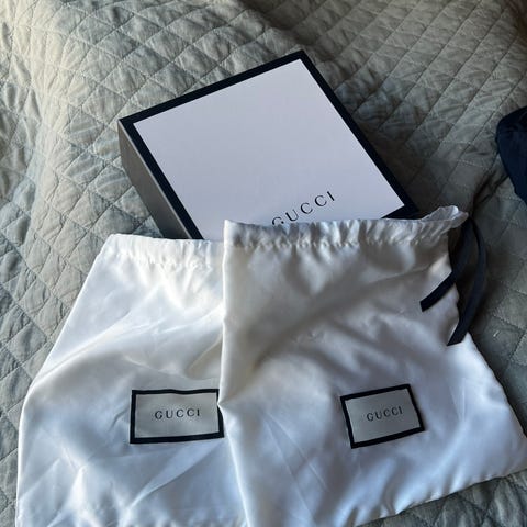 Stor Gucci eske, pose og bånd. Kun brunt til frakt hjem fra butikken, ingen merker eller riper på boksen. Mørk burgunder rød farge. Masse Gucci silkepapir oppi esken.