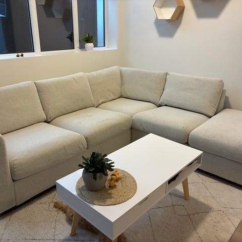 Selger en godt brukt KIVIK sofa med sjeselong fra IKEA. Sofaen er 280 cm bred og er i en lys grå farge.