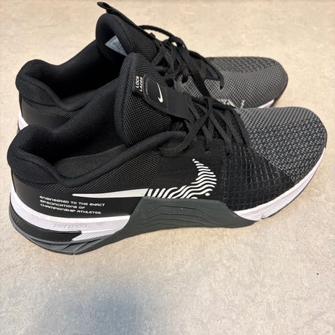 Nike Shox R4 joggesko i størrelse 45. Skoene er i fargene svart og hvit, med karakteristisk Shox-demping i hælen og gummisåle med godt mønster. Overdelen er i syntetisk materiale med perforerte detaljer og snøring foran. Modellen passer som fritids- eller treningssko for voksne med skostørrelse 45.