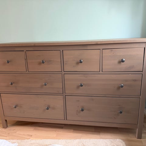 Hemnes kommode fra Ikea med fin brunfarge. Noen år gammel og har fått en del bruksmerker. De to øverste skuffene har blitt litt buet, men fungerer fint til alt som ikke er tungt.
