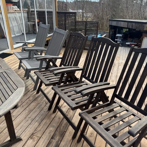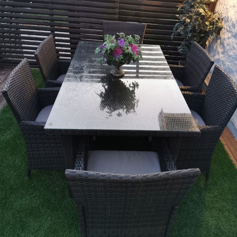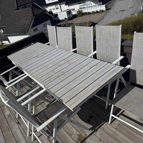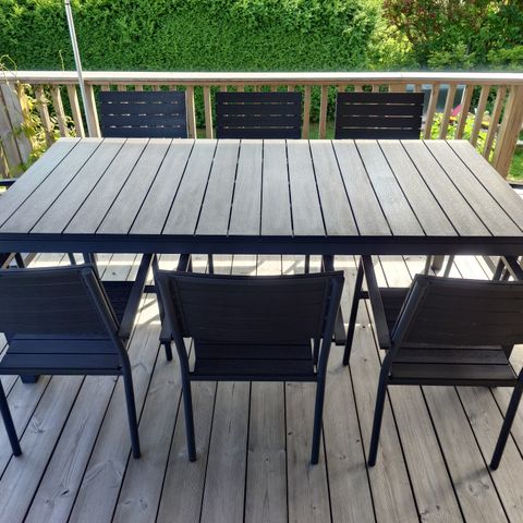 Hagebord og stolsett bestående av rektangulært bord og seks stoler.