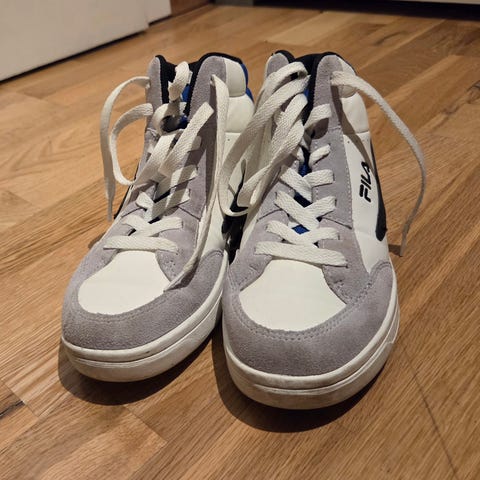 Fila joggesko i størrelse 36 for unisex. Skoene er hvite med Fila-logo på siden og hælen. Modellen har snøring foran og en kraftig, mønstret yttersåle som gir stabilitet. Overdelen er i syntetisk materiale med polstret kant rundt ankelen for ekstra komfort. Passer til hverdagsbruk og fritidsaktiviteter.