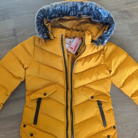 Sprek, gul dunjakke med mykt, deilig fôr i hetten. Pent og lite brukt, i god stand.