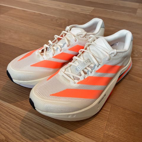 Adidas Adizero Boston 12 løpesko i størrelse 43 1/3. Lette løpesko for løping, med overdel i pustende meshmateriale. Fargekombinasjon hovedsakelig hvit med grønne og svarte detaljer. Yttersåle med gummipartier for grep og slitestyrke, og mellomsåle med demping tilpasset løping på asfalt og harde underlag. En fin intervall sko og mengdesko.