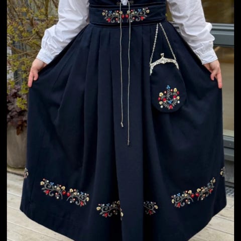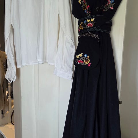 Veldig pent brukt 3 ganger festdrakt med fine detaljer/broderier selges med skjorte, belte, og veske. Str er 42. Dyr og røykfri hus kan sendes