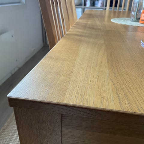 Bord har noen små hakk som nesten ikke synes og et par av stolene har noen skader som vises på bildene.