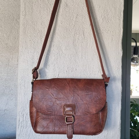 Brun totebag / skulderveske i imitert skinn + liten pouch. I imitert skinn, kjøpt hos Glitter. Passe lange hanker/remer som også kan gå over skulderen. Stort hovedrom med 3 lommer på innsiden, en med glidelåslukking, samt feste for en mindre veske, som også følger med.