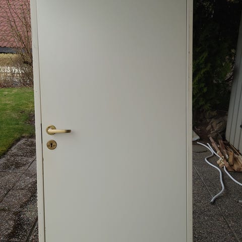 Innerdør i tre med glatt overflate og lys trefarge. Døren har montert dørhåndtak og låskasse. Passer som standard innerdør i bolig, for eksempel til soverom, kontor eller andre rom innendørs. 72x204