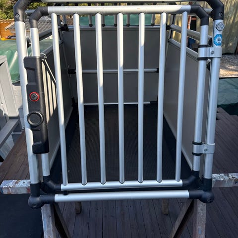 Buret har skrå sider som er tilpasset plassering i bilbagasjerom, med solid ramme og gitterdør i front.