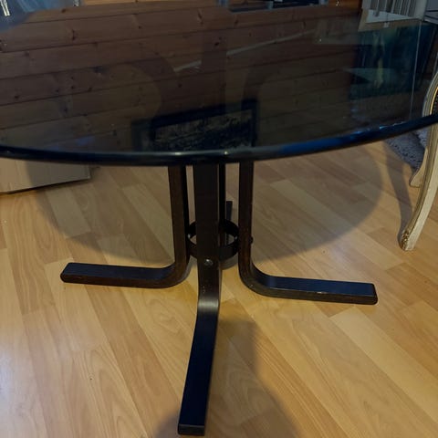 Pent brukt salongbord i sort med sort glass selges. En ripe i glasset, som vist på siste bildet.