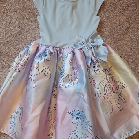 H&M kjole for jente i størrelse 116. Kjolen er laget i polyester og har et flerfarget skjørt med enhjørningmotiv og en stor sløyfe i livet. Overdelen er ensfarget og uten ermer, med glidelås i ryggen for enkel av- og påkledning. Skjørtet er vidt og har et lag under for mer fylde. Passer til bruk ved anledninger som selskap, bursdag eller andre sammenkomster.