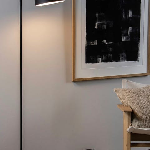 Gulvlampe med fot i metall. Skjerm i linstoff med lett tekstur.