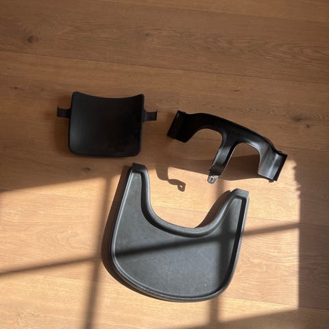 .Settet består av bøyle/front med feste og avtagbart brett/bordplate. Delene er beregnet for bruk sammen med Stokke Tripp Trapp og gir ekstra støtte og egen spiseflate for barnet. Plastmaterialet er lett å rengjøre med fuktig klut.