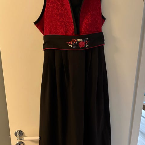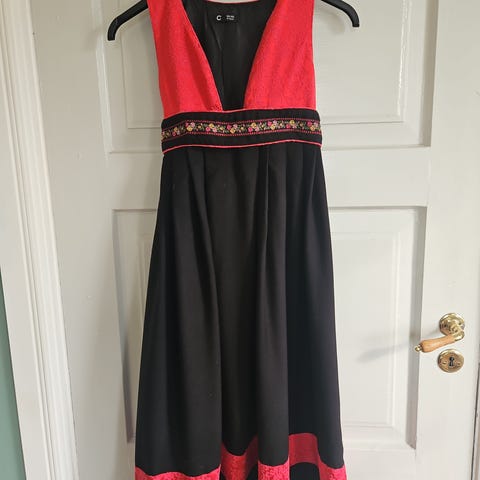 Festdrakt for jente i størrelse 152. Kjolen er flerfarget med hovedfarger i svart og rødt, og har ermeløs overdel. Materialet består hovedsakelig av polyester med noe bomull og elastan i ytterstoffet. Modellen har markert midje med beltedetalj og vidt skjørt som faller ned mot leggen.