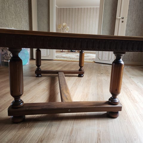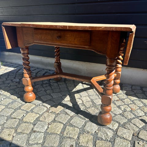 Mahognibord. Alder ukjent men trolig fra rundt 1900. Fine dreide bein. Lett å flytte rundt på. Bordplaten har sprukket opp som vist på bilde nr. 4.