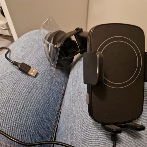Kraftig nattbord-stativ til telefon og nettbrett selges.
