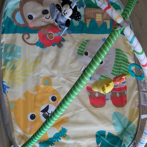 Følger med leker som vist på bildet. Den største lager lyd og lys 🥰