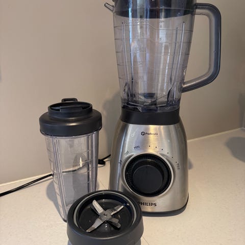 Det flate bladet er ideelt for å bearbeide harde ingredienser som bønner og nøtter, eller til å piske krem. Kryssbladet brukes til mosing og vanlig blending av frukt, grønnsaker eller andre mykere ingredienser. Blenderen leveres med to kopper i solid tritan-plast (0,8 L og 0,5 L), samt praktiske lokk for både oppbevaring og drikking.