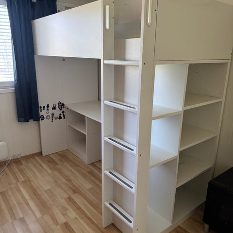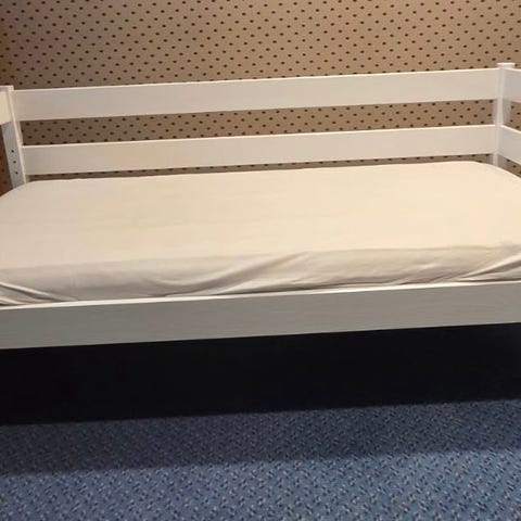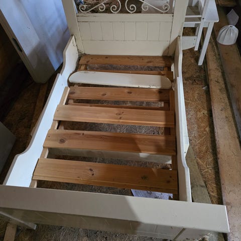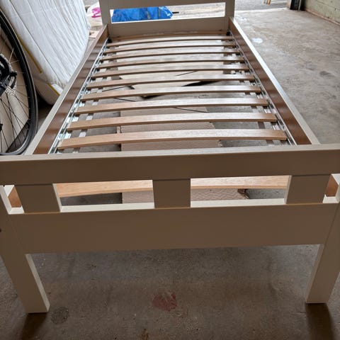 Juniorseng i hvit gies bort. To forskjellige størrelser. Passer som overgangsseng mellom sprinkelseng og vanlig enkeltseng for barn.