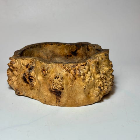 Denne store, vakre telysestaken er skåret ut av nydelig marmor eller alabast. Staken er skåret ut så den minner om en trestubbe, grov og ruglete på utsiden, og blank på over- og undersiden. Dette er en herlig rustikk lysestake, og mønsteret i steinen er svært pent. Staken fremstår som pen, selv om de finnes bruksspor. Se bilder! Høyde: 4,5 cm. Bredde: 10 cm. Diameter åpning: 6,5 cm. Vekt: 280 g.