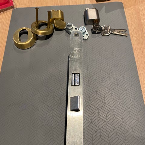 Assa abloy låsekasse med sylinder og tilbehør . Pakken inneholder låskasse, sylinder, sluttstykke, skruer og 4 nøkler. Er helt ubrukt og bare demontert fra en ny dør pga bruk av smartlås