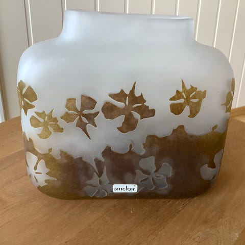 5 større blanke glassvaser og 6 små brun/lilla vaser selges. Brukt i dåp en gang.