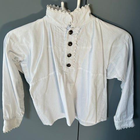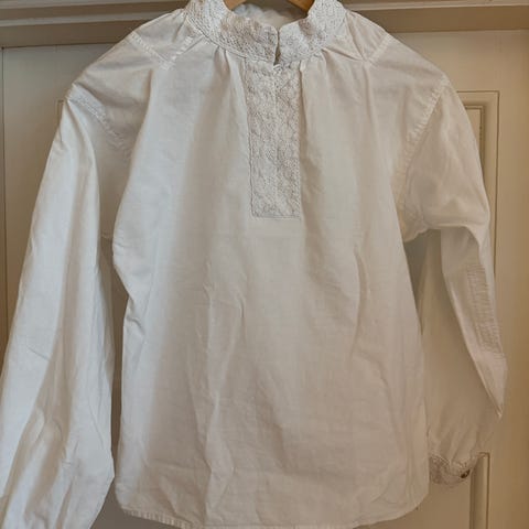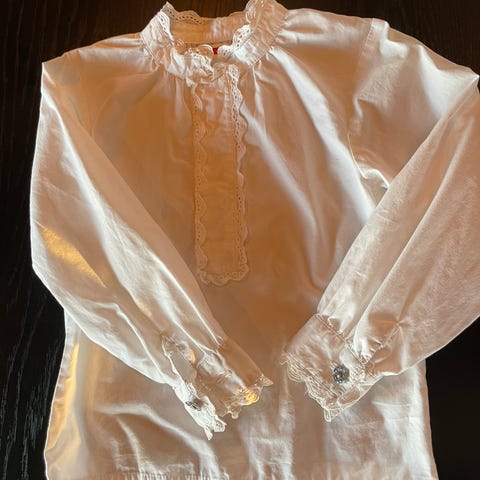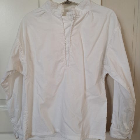 Lindex bluse for barn i størrelse 116. Blusen er hvit og laget av bomull. Modellen har lange ermer, rund hals med rynkedetaljer og knappelukking foran.