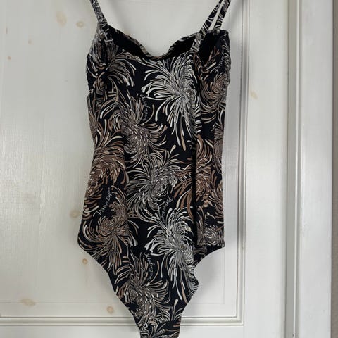 Badedrakt for dame i størrelse L. Badedrakten har grønn bunnfarge med flerfarget mønster og smale skulderstropper. Fôret innside for bedre komfort. Egnet til svømming og annen bruk i vann.