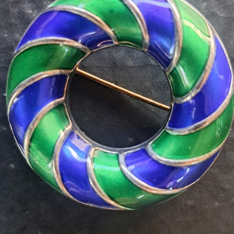 Pen brosje i sølv og emalje.