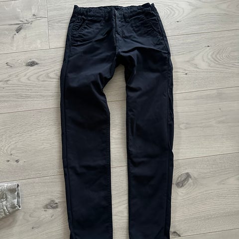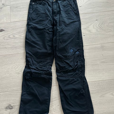 Polarn O. Pyret olabukse for gutt i størrelse 152/158. Buksen er i blå denim og laget av bomull. Klassisk femlommersmodell med glidelås og knapp i front samt baklommer.