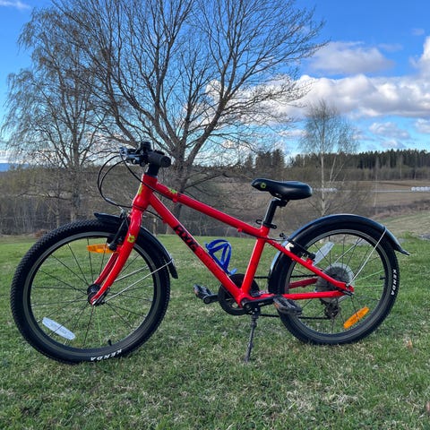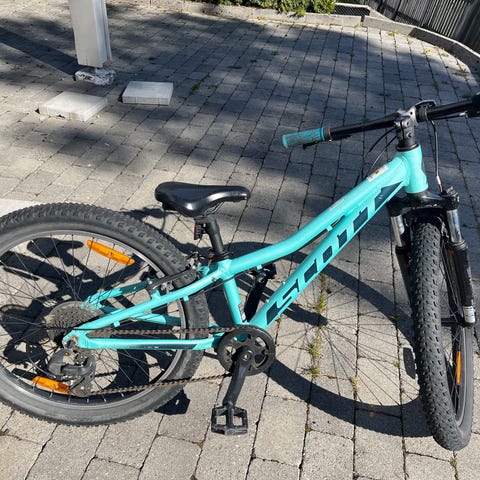 Scott sykkel med 24" hjul i kul oransje farge. Sykkelen har rett styre, sadel med justerbar setepinne og grove dekk som gir godt grep på variert underlag. Utstyrt med pedaler, reflektorer og gir bak. Passer som juniorsykkel til barn som har vokst ut av mindre barnesykler med mindre hjulstørrelse.