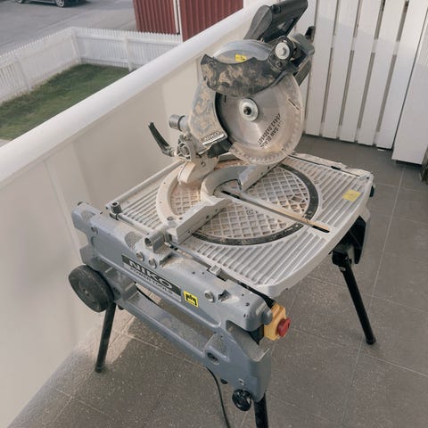 I tillegg følger det med en elektrisk kapp- og gjærsag (ukjent merke/modell) montert på arbeidsbenk. Denne sagen er egnet for tverrkutting og gjæringskutt i lister, plank og annet trevirke. Begge maskiner drives av strøm via kabel og er beregnet for stasjonær bruk i verksted, garasje eller tilsvarende arbeidsplass.