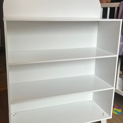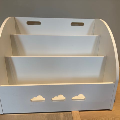 Pent brukt bokhylle fra Alice & Fox. Hyllen har flere åpne rom i høyden som gjør det enkelt for barn å se og hente bøker selv. Passer på barnerom, lekerom eller stue for organisering og oppbevaring av barnebøker og hefter.