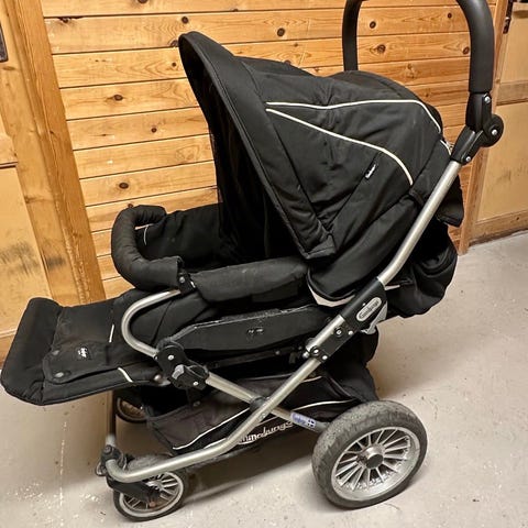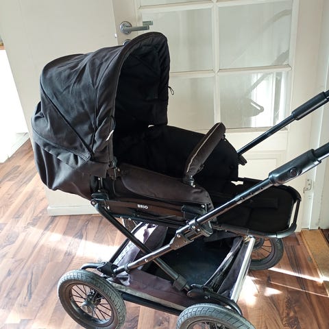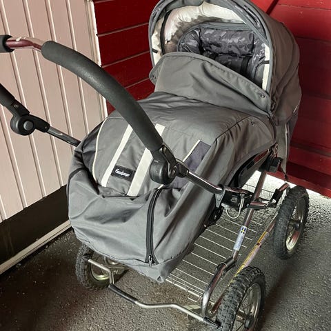 Emmaljunga barnevogn i svart tekstil. Vognen har justerbart håndtak, stor kalesje med uttrekkbar solskjerm og mykt polstret sittedel/liggedel. Understellet har fire hjul og romslig varekurv under vognen. Passer til bruk for ett barn. Det følger med frontbøyle og integrert oppbevaringslomme på kalesjen.