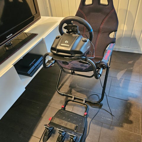 Guttungen selger racingsimulatoren sin, da interessen har avtatt. Dette er den ultimate cockpiten for barn da alt er justerbart og laget til på barnas nivå. Riggen fremstår svært pent brukt.