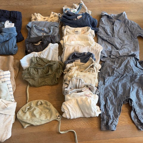 Stor klespakke i str 56 til tvillinger til salgs. Flere plagg i nøytrale farger som beige, grønn, hvit og mørk blå. Inneholder hovedsakelig sett - 26 plagg + 8 park sokker